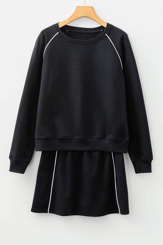 Black Contrast Piping Crewneck Pullover Mini Skirt Set